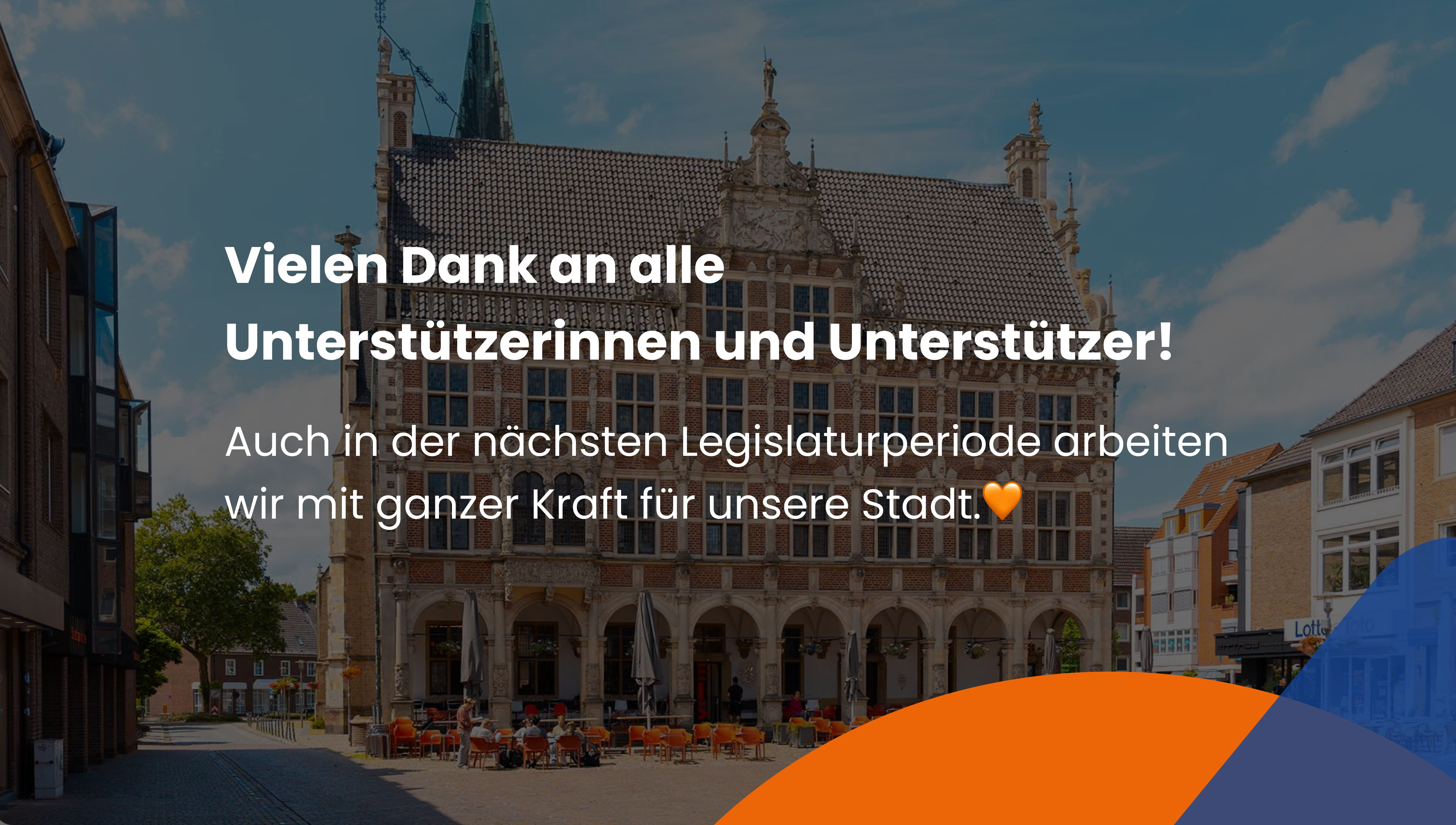 Bocholt ist lebendig, vielfältig und liebenswert – eine Stadt mit Charakter und Herz. Zwischen grünen Parks, belebter Innenstadt und starker Gemeinschaft wollen wir das bewahren, was Bocholt ausmacht, und zugleich neue Ideen für eine noch bessere Zukunft umsetzen.
